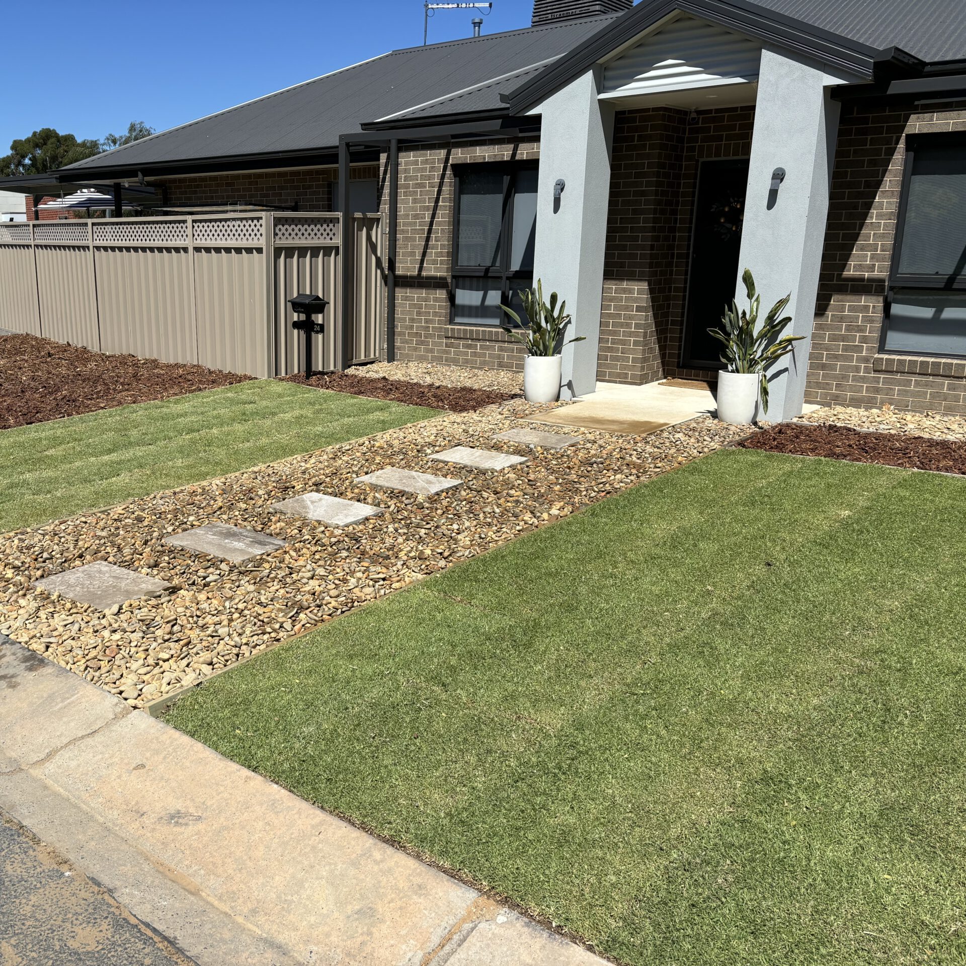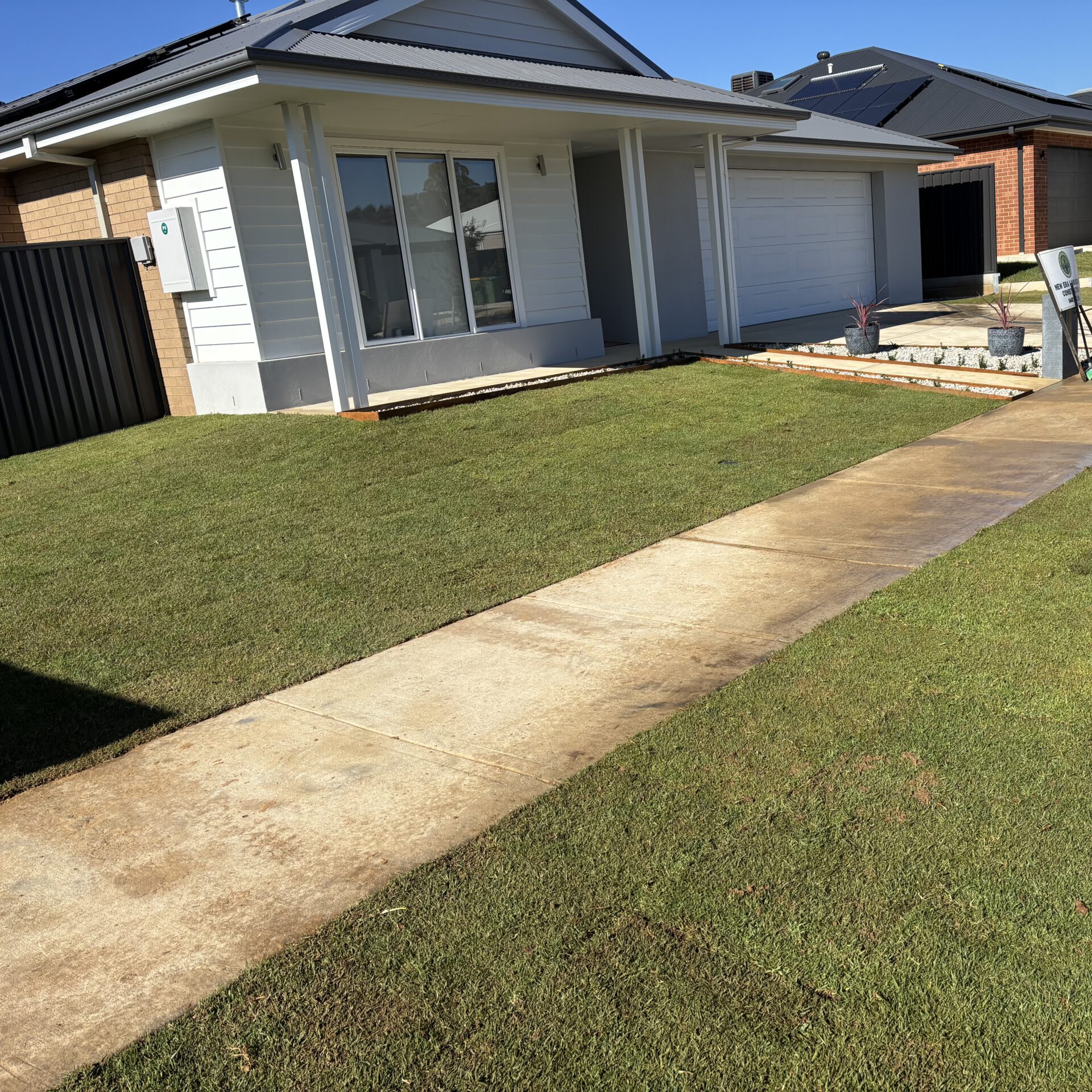 • Jordan has undertaken two separate projects for us at our new house. An elevated paved outdoors entertainment area and a complete returf and irrigation of our front lawn. The outdoors area required a lot of consultation as we were unsure exactly what we could do and how it would end up looking. Jordan was great to deal with, explaining the options and how it would all come together. He was very patient and nothing was a problem. When we bought our house, the front yard was a disaster. Just dirt, dead grass and weeds. Jordan dug it all up, did some landscaping, installed automatic irrigation and then laid new turf. It’s now a pleasure to look at and maintain. We are very pleased with both projects results and would recommend Jordan and New Era Landscape Construction without hesitation.